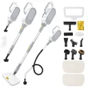 Zubehörliste: Verlängerungsstangen (2 Stk.), Gewinderohr (1 Stk.), Fugenbürste (1 Stk.), Rundbürste (1 Stk.), Teppichgleiter (1 Stk.), Moppkopf (1 Stk.), Schaber (1 Stk.), Scheuerkopf (1 Stk.), Fensterbürste (1 Stk.), Dampfglätter-Aufsatz (1 Stk.), Wassertank (1 Stk.), Winkeldüse (1 Stk.), Kupferbürstenkopf (1 Stk.), Dampfglätter-Bezug (1 Stk.), Mopptücher (2 Stk.)
